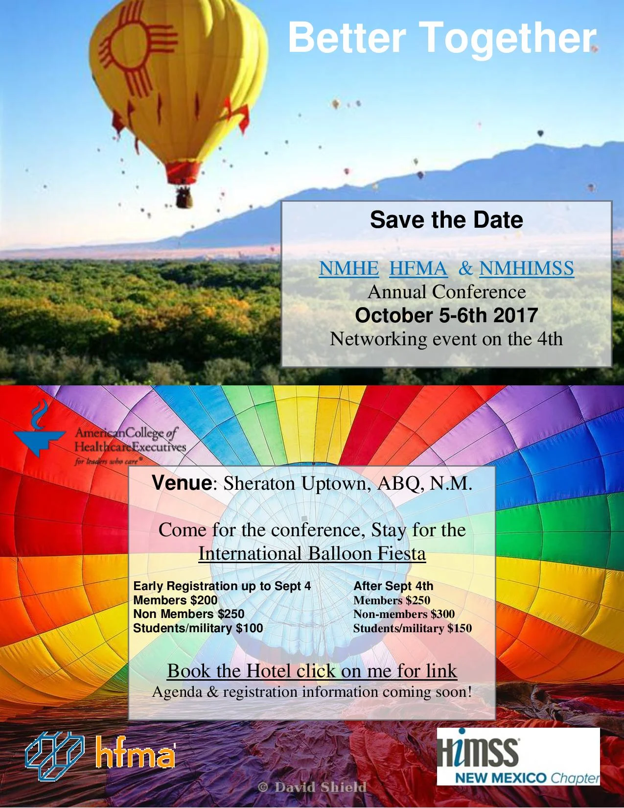 The New Mexico Chapters of the Healthcare Financial Management Association (HFMA), the American College of Healthcare Executives (ACHE), and Health Information and Management Systems Society (HIMSS) are proud to announce our joint 2017 fall conference! We have designed our agenda to address many pressing and timely issues affecting healthcare in New Mexico. This is an opportunity no healthcare professional should pass up.