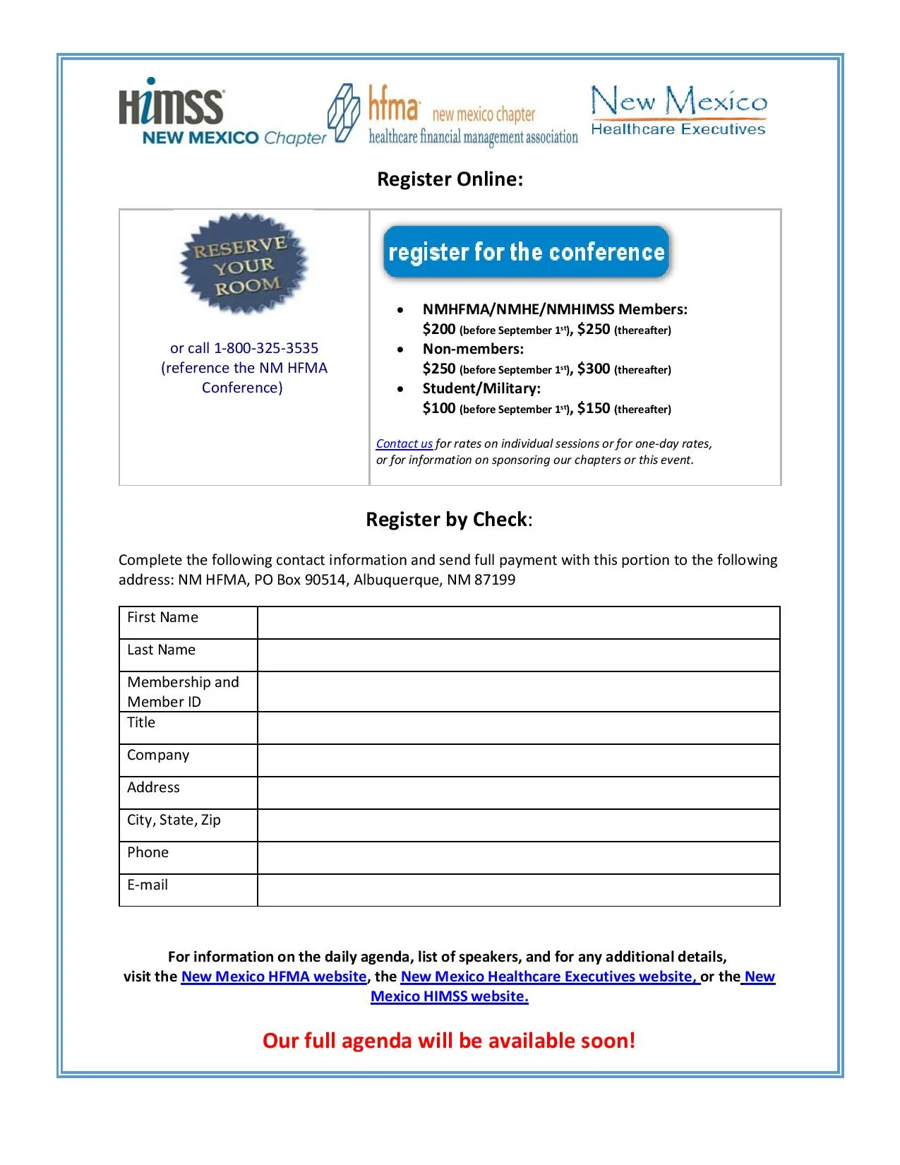 Registration: See the detailed registration instructions on the NM HFMA website at www.nmhfma.org or the NMHE website at http://www.nmhe.org/.