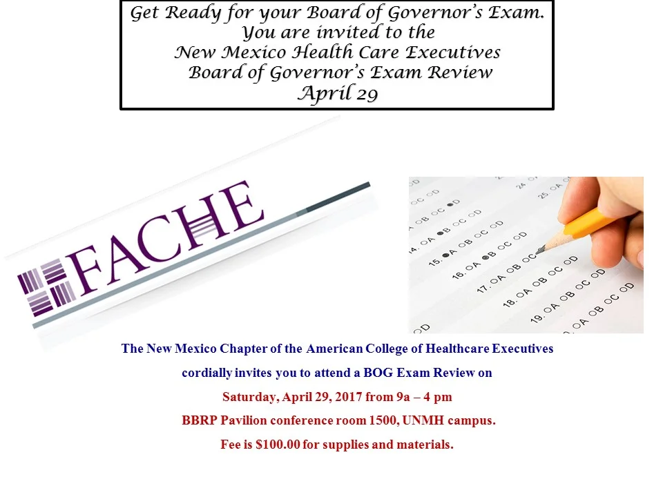 The New Mexico Chapter of the American College of Healthcare Executives cordially invites you to attend a BOG Exam Review on Saturday, April 29, 2017 from 9a – 4 pm